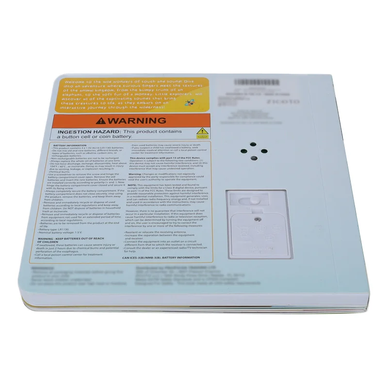 Sünkroonitud helilugu: sisseehitatud kvaliteetne helimoodul, mis toetab nupuvajutuse või lehe pööramise käivitatavat lugude esitamist. Heli on selge, müraeta (hüüdlävi ≤85 dB, vastav lapslaste kuulmise ohutusnõuetele) ja saab kohandada mitmekeelse dubleerimisega, näiteks hiina, inglise ja kahekeelse variandiga. Loo sisu sobib erinevate varajase õppe teemade – nagu kognitiivne ärkamine, käitumisharjumused ja klassikalised muinaslood –ga kokku, realiseerides kolmik-interaktiivse kogemuse "puudutus + kuulmine + nägemine".