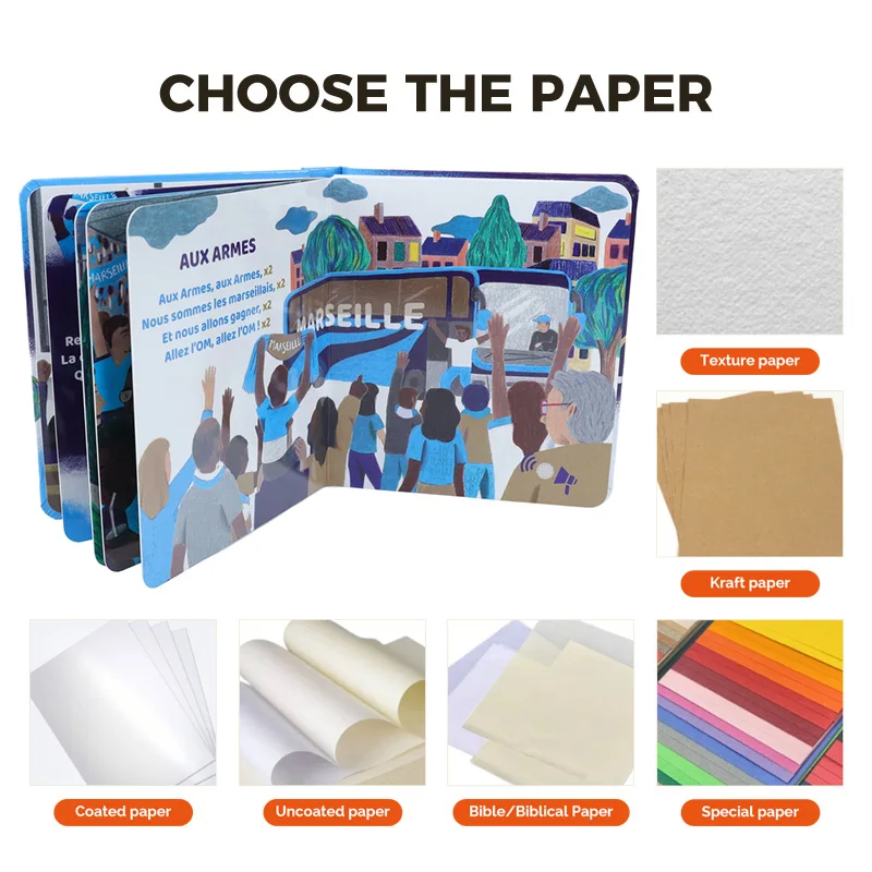 Crafted from thick, food-grade cardboard pages (2mm+ thickness) and bound with professional perfect binding (reinforced for tear resistance), the hardcover book is built to withstand rough handling by young children (e.g., page tearing, drops). We offer full on-demand customization: from hardcover material (matte/glossy textured paperboard) and size (12x18cm pocket-friendly to 24x30cm classroom-sized) to printing content (brand logos, localized educational themes, custom illustrations) and sound sensor settings (audio language, clip duration, trigger sensitivity).
